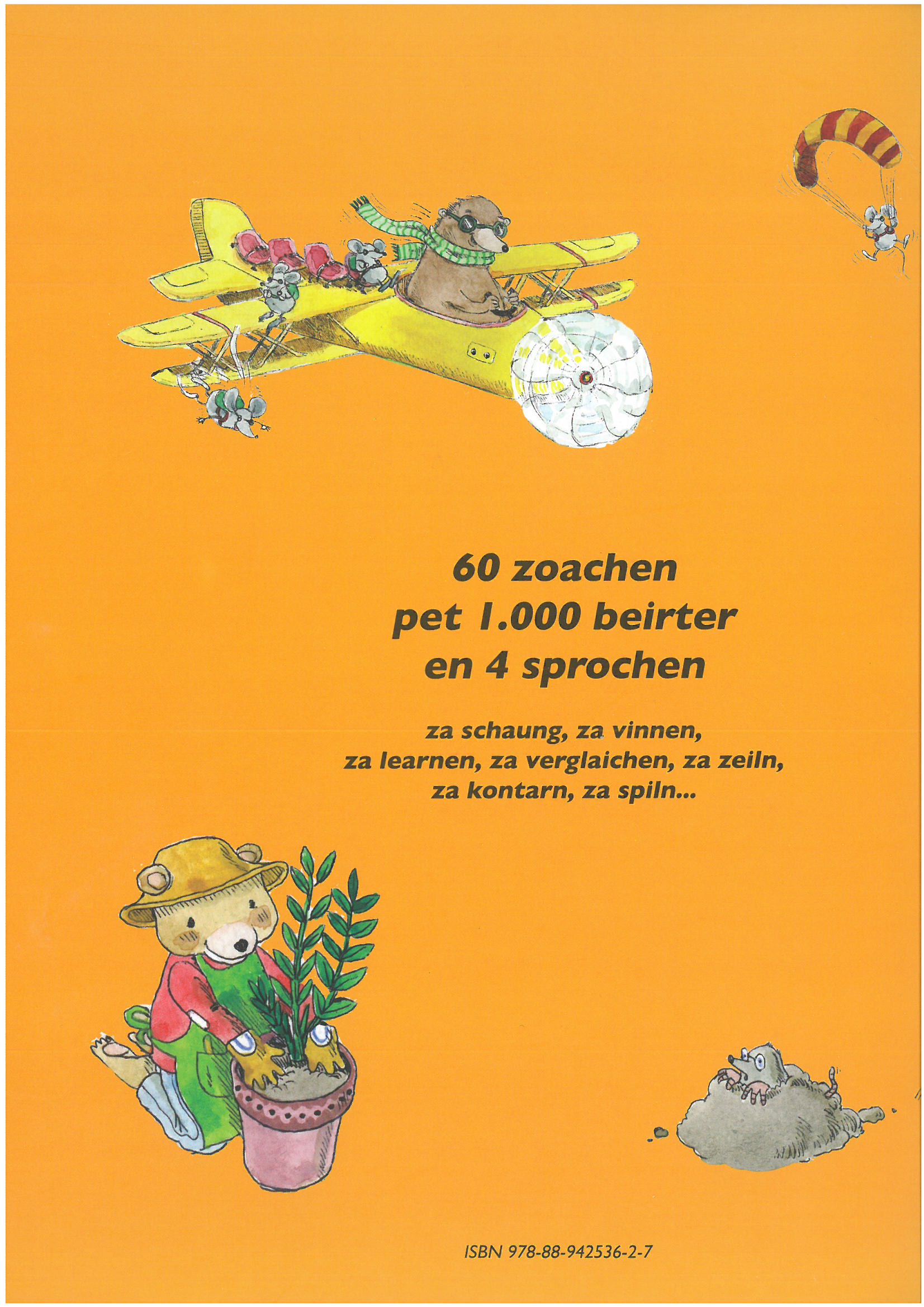 60 carte di tavola a colori comprendono più di mille termini in quattro lingue: mòcheno, italiano, tedesco e inglese. Con indice finale delle parole in mòcheno.